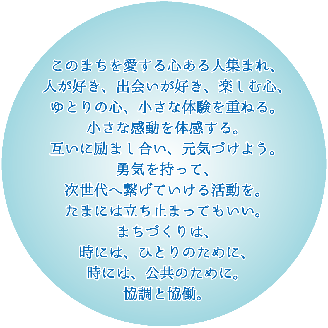 潤い、安らぎ、澄んだ空、水、みどり、生き物、アメニティづくり。